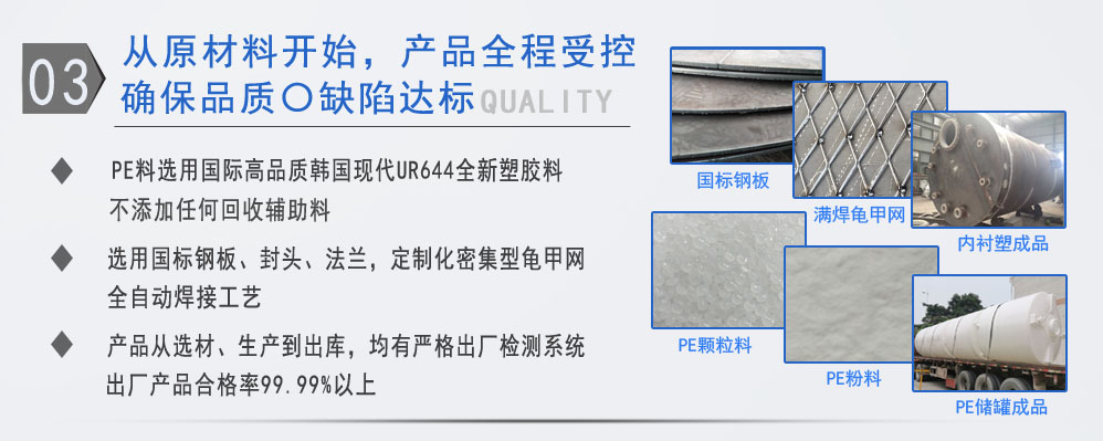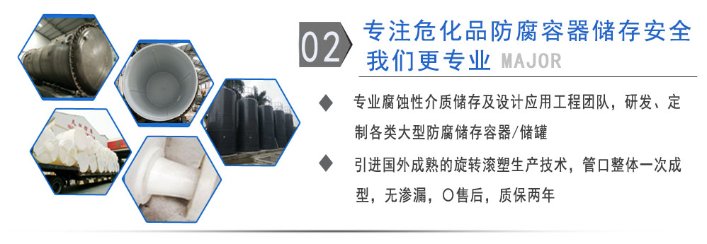 公司有鋼襯塑PE/PO、PE全塑、碳鋼、不銹鋼四大系列100多個(gè)品種,專(zhuān)注于常壓儲(chǔ)存容器生產(chǎn),其產(chǎn)品包括鋼襯塑儲(chǔ)罐、管口一體成型PE儲(chǔ)罐、碳鋼儲(chǔ)罐不銹鋼儲(chǔ)罐、反應(yīng)釜、攪拌罐、離子交換柱、鋼襯PE/PO儲(chǔ)罐、塑料儲(chǔ)罐鹽酸儲(chǔ)罐、硫酸儲(chǔ)罐等等。更大限度滿(mǎn)足廣大客戶(hù)的各種需求,同時(shí)可以根據(jù)客戶(hù)的需要加工定制各種防腐設(shè)備。